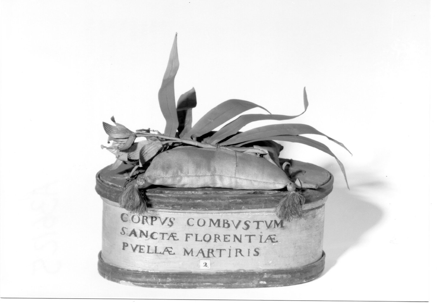 Reliquiario a forma di scatola ovale. Sul coperchio un cuscinoe una foglia di palma