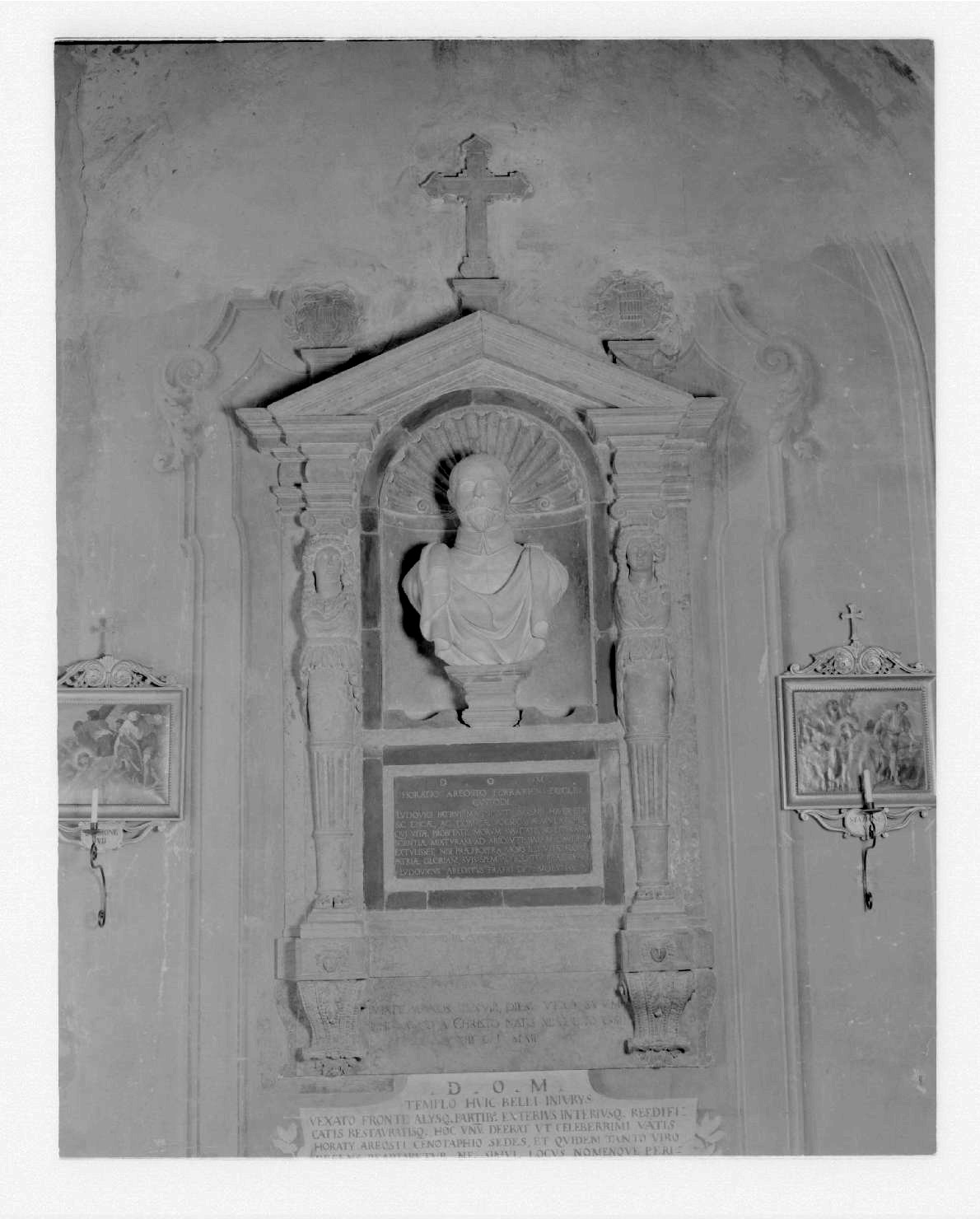 Monumento funebre a struttura architettonica di tempietto antico con due telamoni, timpano sormontato da una croce, nella nicchia interna è posto il busto di Orazio Ariosti