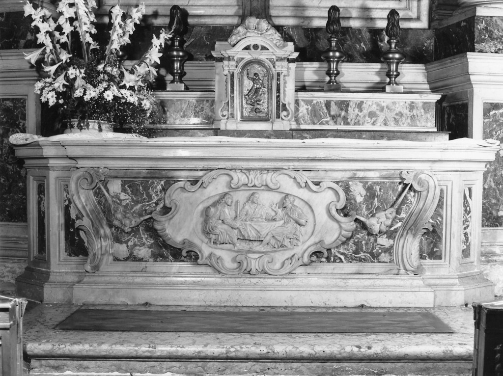 Importante altare in marmo scolpito: mensa trapezoidale che ospita un paliotto in marmo scolpito con scena dell'Ultima Cena; ancona architettonica caratterizzata da timpano sopra il quale sono seduti angeli in marmo bianco