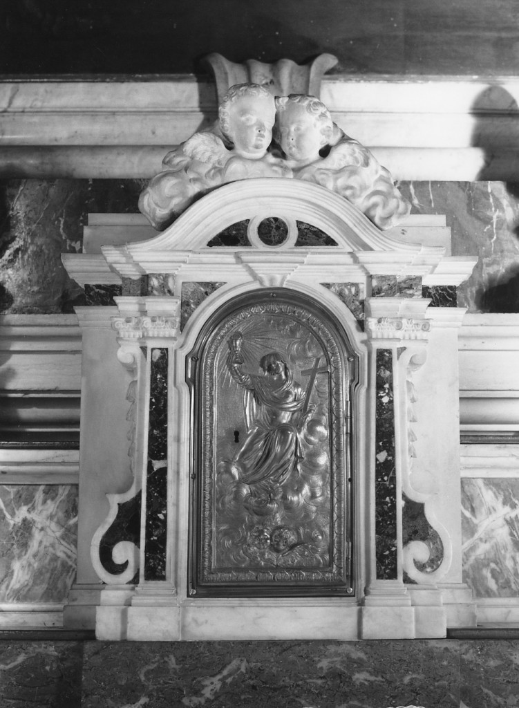 Tabernacolo a frontale architettonico caratterizzato da lesene laterali coronate da capitelli e cimasa flessa sormontata da testine di angioletti