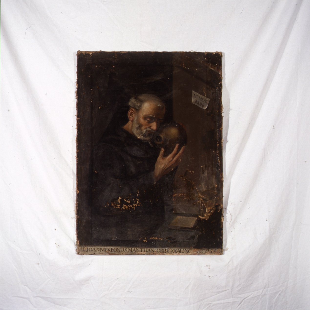 In un interno, ritratto del santo a mezza figura con un teschio in mano