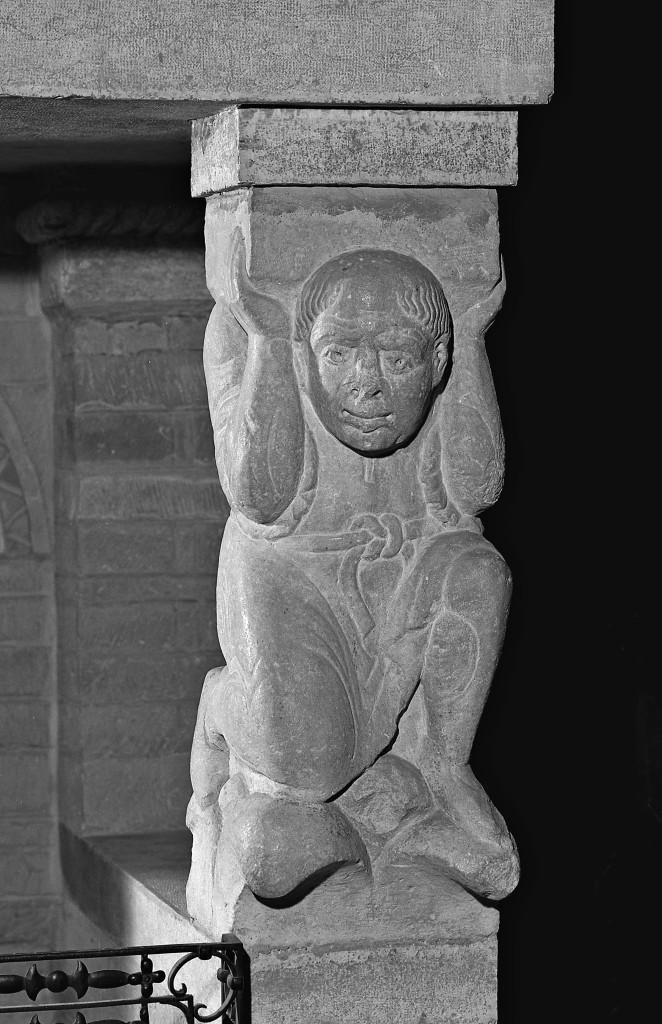 Figura umana accucciata che regge sulle spalle il capitello sul quale è appoggiata la trabeazione del pulpito