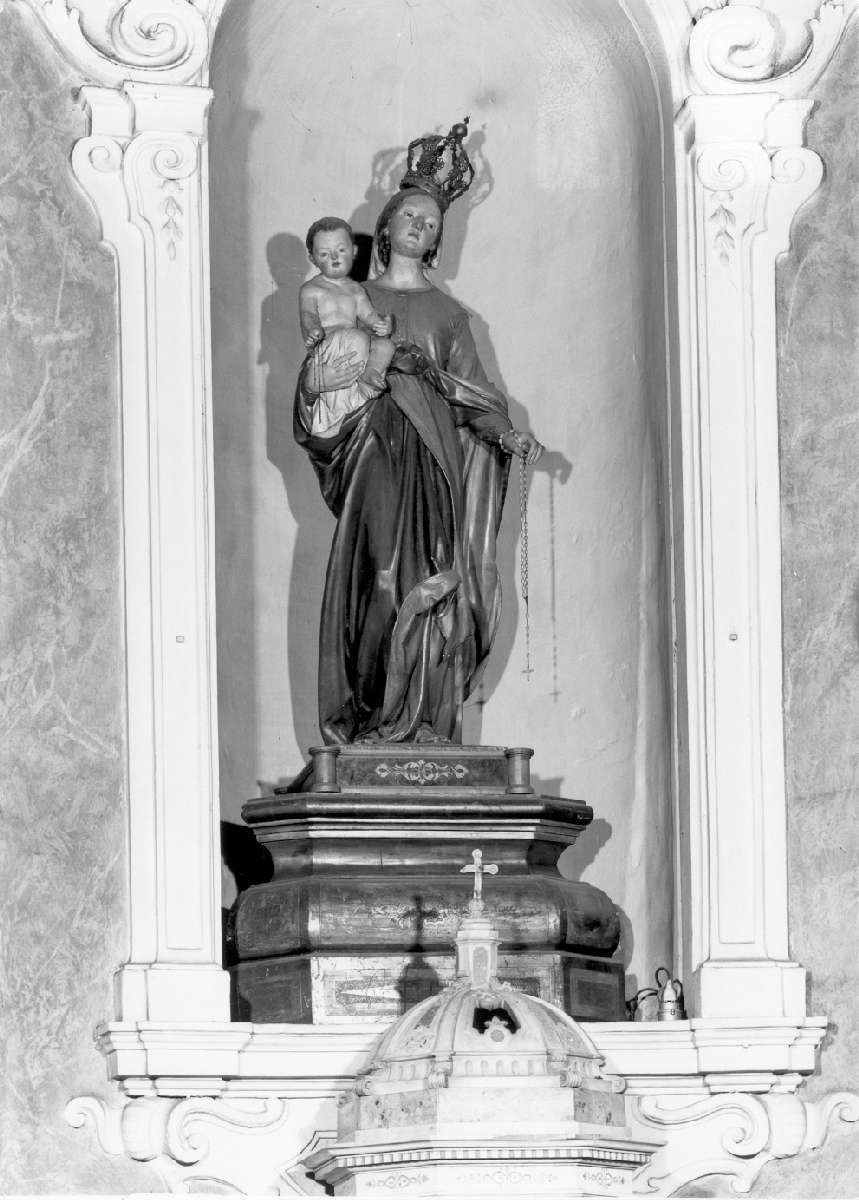 Statua in cartapesta policroma posta su un basamento in legno dorato. il capo della Vergine è adornato da una corona in metallo (argento ?)