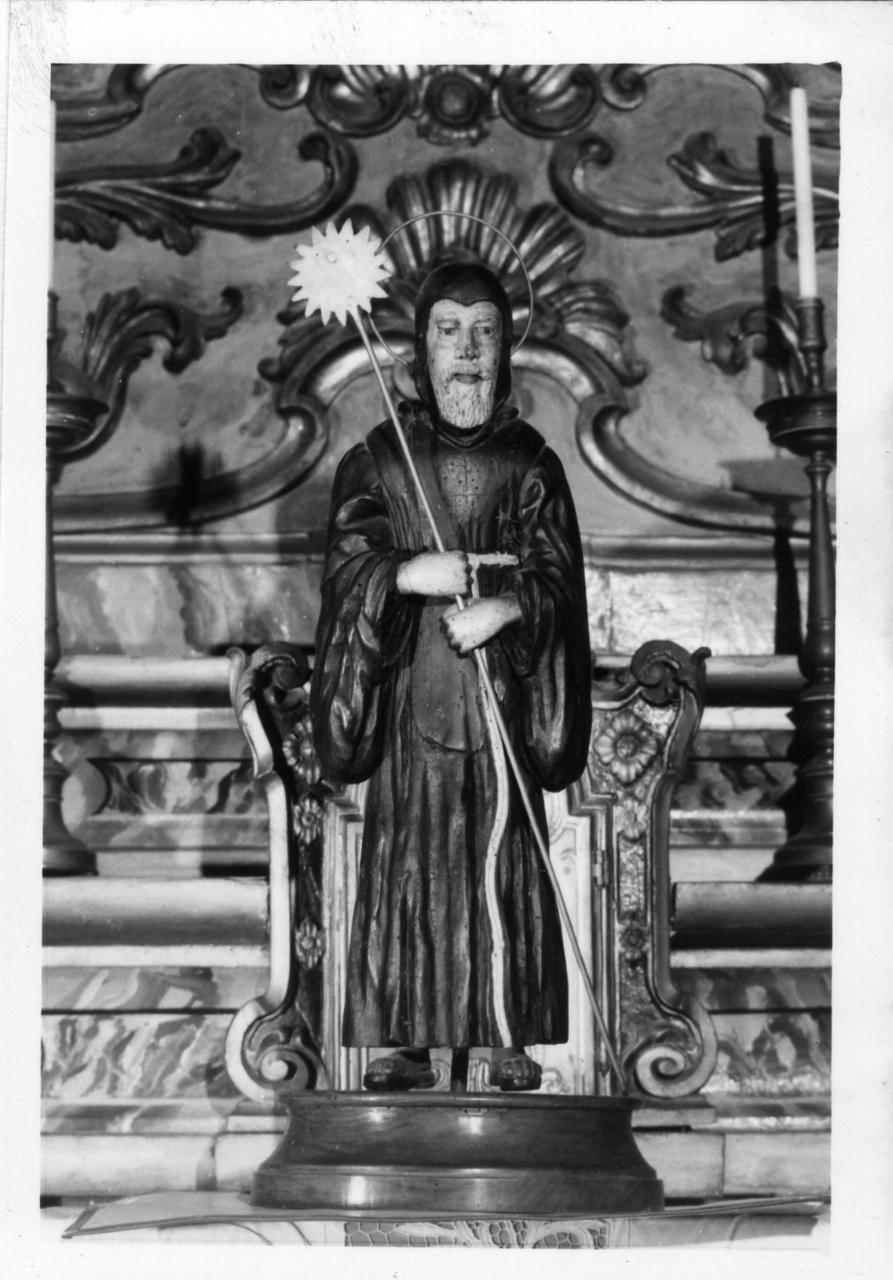 Legno intagliato e policromato. A tutto tondo, il Santo è in piedi, con tonaca bruna e nelle mani il bastone recante il motto "Charitas". Base ovale di legno verniciato