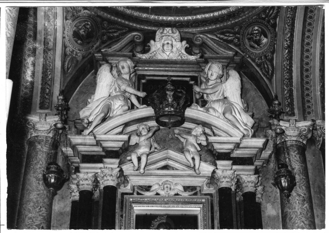 Su di una base a mensola, sei colonnine di marmo nero con capitelli corinzi in marmo bianco reggono una trabeazione a timpano ricurvo sotto cui due angeli in marmo reggono una corona in metallo argentato; due angeli sono sulla trabeazione su di un fastigio a timpano spezzato con lapide