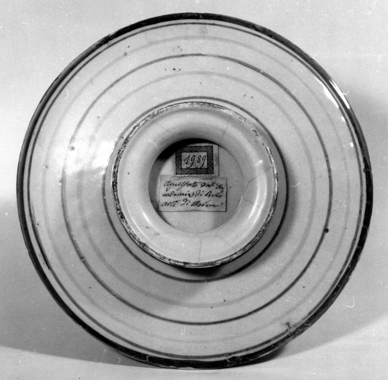 • NOTIZIE STORICO CRITICHE L'alzata con soggetto biblico della condanna dei progenitori (Genesi, II, 1-5) proviene probabilmente dal mercato antiquario, in quanto acquistata nel 1863, dietro finanziamento del Ministero dell'Istruzione Pubblica, presso il collezionista modenese Giuseppe Giusti dall'Accademia di Belle Arti di Modena integrata alla Galleria Palatina (oggi Estense). E' stata correttamente assegnata alla bottega urbinate dei Patanazzi (Liverani F. 1979) per affinità stilistiche e iconografiche con la decorazione di un vaso della farmacia della Santa Casa di Loreto, sul quale compare anche lo stesso soggetto raffigurato in un'altra alzata della Collezione estense (vedi scheda 0800229252). Si suggerisce una datazione al 1620-30 in base ad altri confronti con pezzi della bottega dei Patanazzi rinvenibili nei musei di Bologna, Pesaro, Braunschweig, ecc