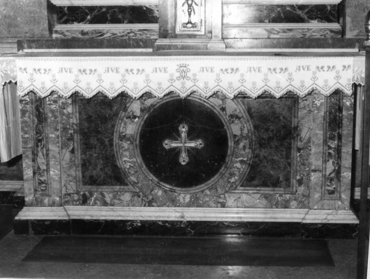 Il paliotto ha disegno geometrico con fondo verde, spartito da cornici a paraste leterali; al centro mostra un disco di marmo rosso di Francia con croce di legno dorato