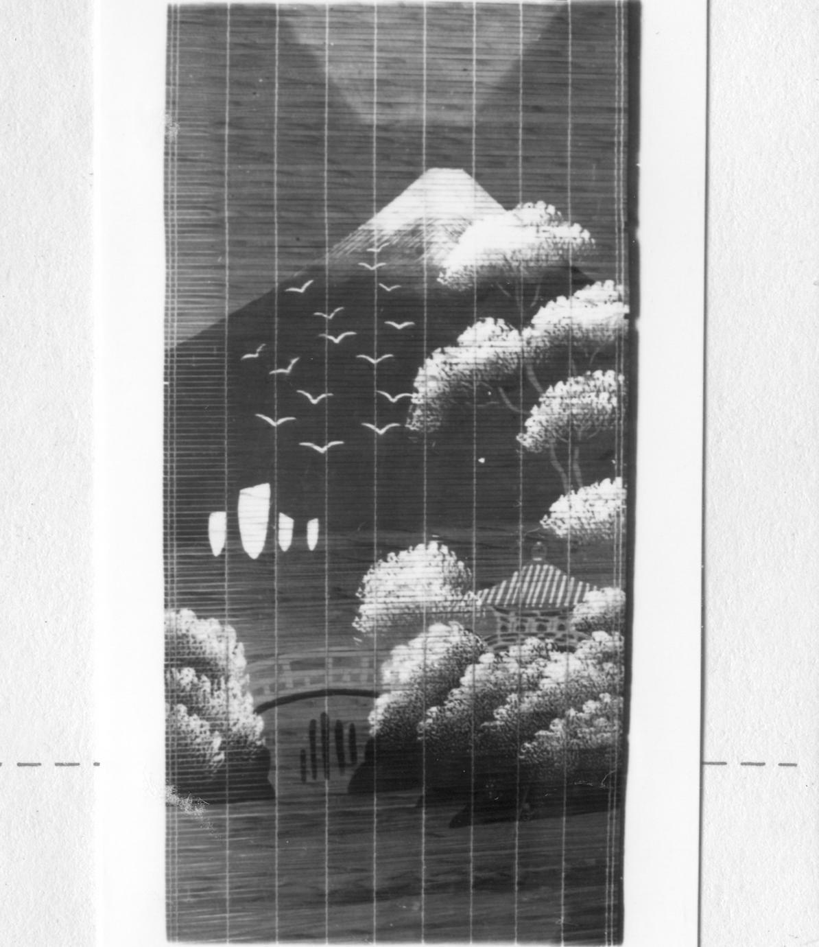 Paesaggio di ispirazione giapponese con motivo tradizionale vedutistico. Un vulcano, alberi, ponticelli, arbusti pagoda. Nei colori vivacissimi, sfumati in azzurro, verde, rosato, accenni di giallo, azzurro, oro nella pagoda. Esecuzione su asticelle di bambù cucite tra loro a formare una stuoia o tendina
