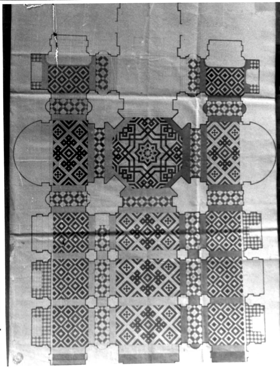 Disegno a penna su carta, acquerellato nei colori verde pallido-oliva e rosso. Il tracciato segue la pianta della chiesa, indicando con precisione il disegno geometrico a rombi intrecciati delle mattonelle che costituiscono il progettato pavimento. Sotto la cupola si espande in stella