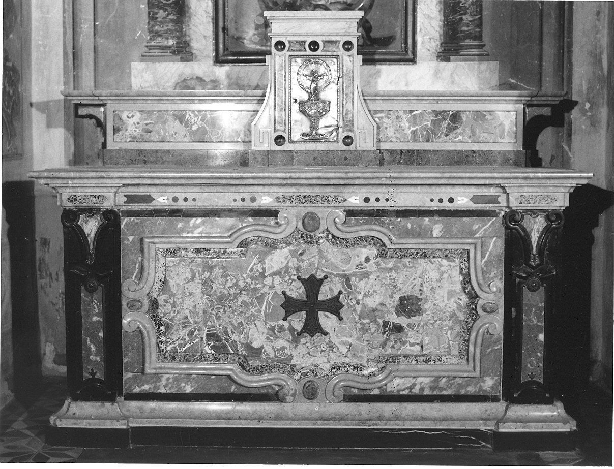 L'altare con gradino a singolo ripiano in cui è inserito un tabernacolo a frontale architettonico in marmo si caratterizza per il bel paliotto. In questo marmi policromi disegnano una cornice sagomata a rilievo i cui lati sono interrotti da volute contrapposte con ovato centrale bombato; al centro della cornice è una croce di Tolosa in marmo nero