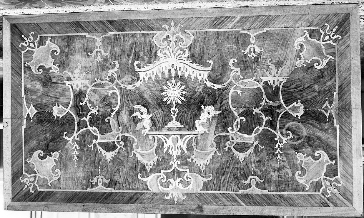 Piano di forma rettangolare impiallacciato in noce, riccamente intarsiato con legni diversi raffigurante tra ornati a volute e bandelle due angeli genuflessi in adorazione dell'Eucarestia. Gambe rastremate prive come la fascia di intagli decorativi. E' dotato di un cassetto