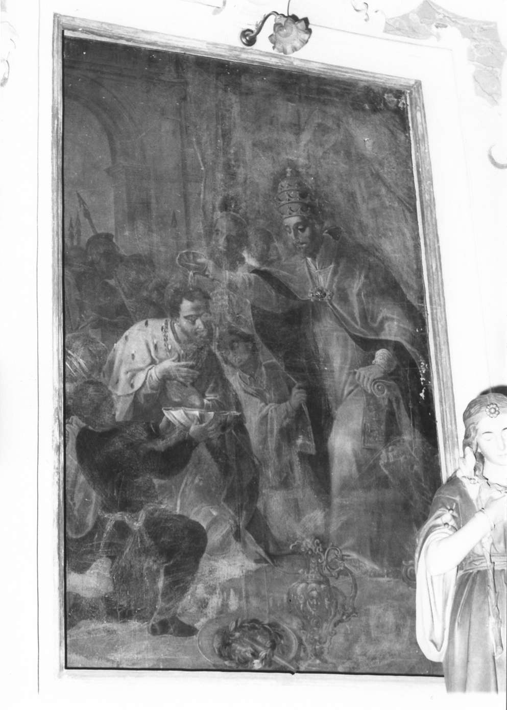 L'episodio è ambientato all'interno di un'aula architettonica caratterizzata da grandi arcate. In primo piano San Silvestro versa l'acqua sul capo di Costantino, inginocchiato su un tappeto rosso