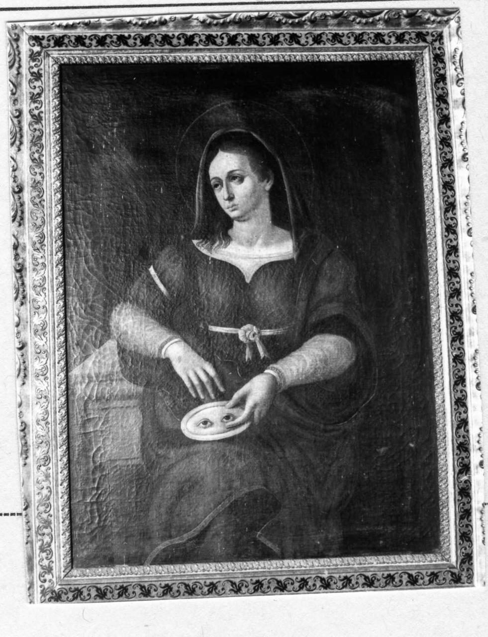 Figura a due terzi di persona di Santa Lucia, vista frontalmente, appoggiata a un parapetto di balaustra, tenente tra le mani il vassoio con gli occhi e la palma del martirio. Indossa tunica arancione serrata, alla vita, da un nastro bianco e manto azzurro bordato in giallo oro. Il fondo è scuro, omogeneo. Cornice novecentesca di legno e stucco dorato