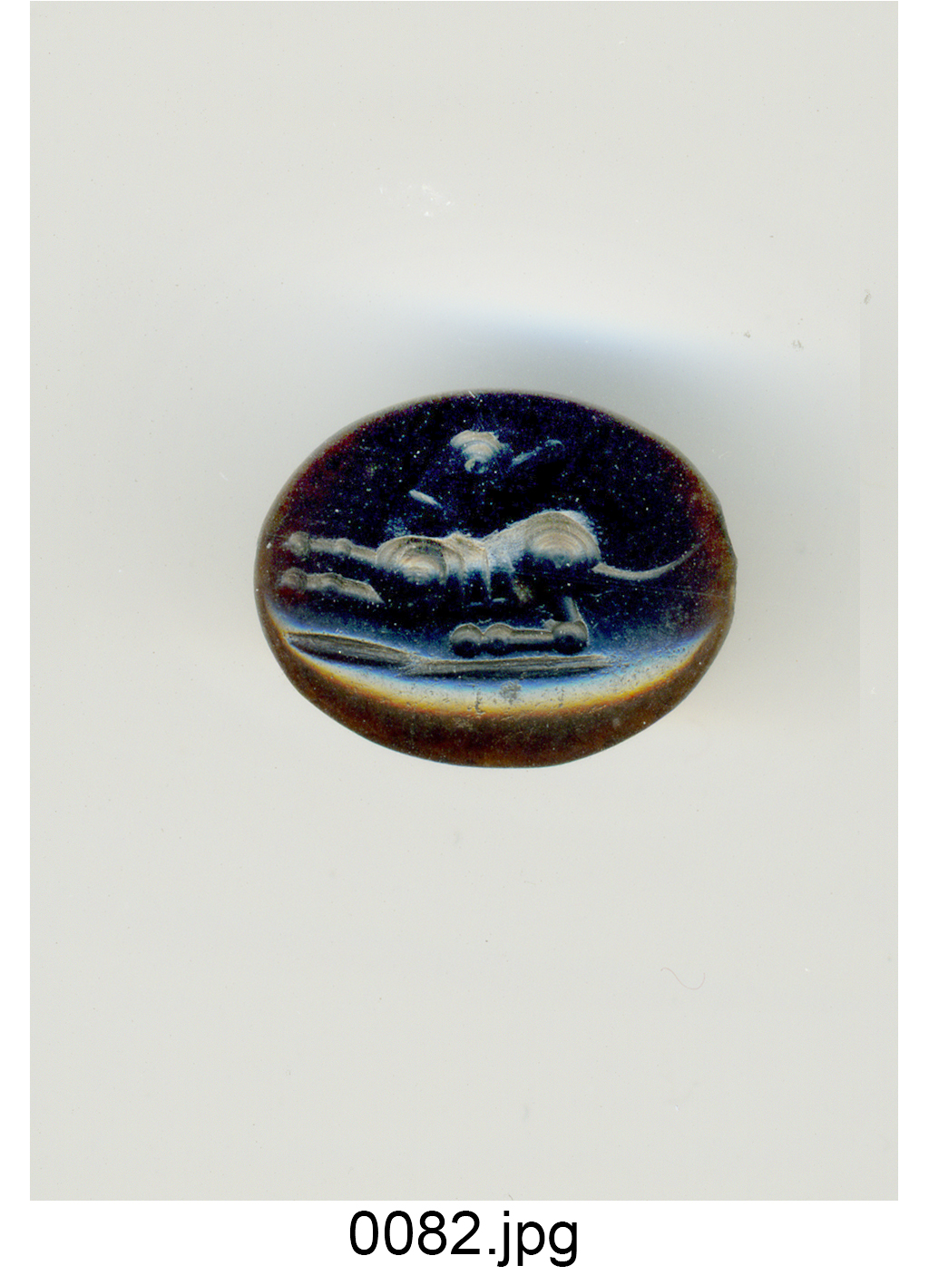 - NOTIZIE STORICO CRITICHE REVISIONE: Il cane, variamente atteggiato (in corsa, in atto di balzare in avanti, in punta, in ferma o giacente), compare abbastanza frequentemente come soggetto esclusivo nel repertorio glittico di età romana: cfr.ad es. in generale Sena Chiesa 1966, tav. LV, nn. 1079-1089; AGDS I/3, Muenchen, tav. 198, nn. 2257-2258; tav. 219, nn. 2422-2423; AGDS IV, Hannover, tav. 37, n. 221; tav. 89, nn. 690-692; tavv. 164-165, nn. 1214-1220; AG Wien I, tav. 18, n. 96; tav. 24, n. 132; tav. 25, nn. 135-137; Maaskant-Kleibrink 1978, p. 122, n. 151; p. 313, n. 926; AG Wien II, tav. 47, n. 891; tav. 94, nn. 1145-1146; D'Agostini 1984, p. 24, n. 13; Mandrioli Bizzarri 1987, p. 48, n. 21; p. 63, n. 61; p. 117, n. 228; AG Wien III, tav. 45, nn. 1893-1901; Dembski 2005, p. 131, tavv. 79-80, nn. 784-787. Tra queste, possono essere maggiormente avvicinati al soggetto della gemma della Galleria Estense soprattutto: Sena Chiesa 1966, tav. LV, 1089 (p. vitrea: cane da caccia in ferma); AGDS I/3, Muenchen, tav. 219, n. 2422 (corniola, I sec. a.C.-I sec. d.C.: levriero con collare avanzante con muso abbassato); AGDS IV, Hannover, tav. 164, n. 1214 (corniola, I sec. d.C.: cane da caccia con muso proteso); AG Wien II, tav. 94, n. 1146 (granato, I sec. a.C.-I sec. d.C.: levriero in atto di attaccare); AG Wien III, tav. 45, n. 1893 (diaspro rosso, II sec. d.C.: cane da caccia con collare, con una zampa sollevata)