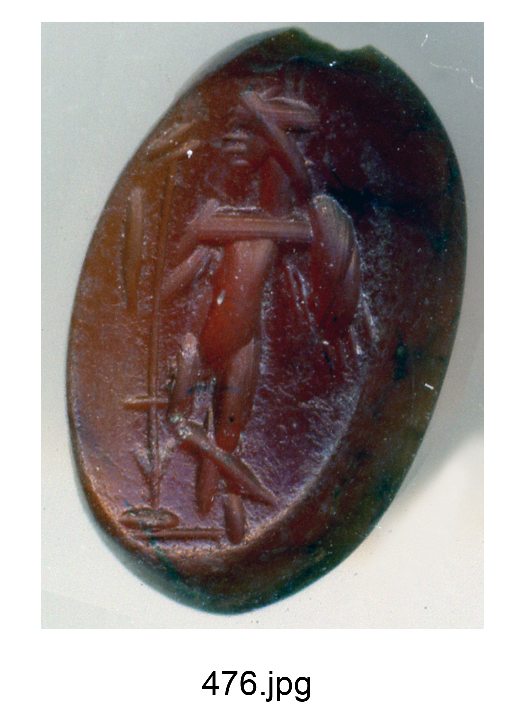 Corniola rosso-arancio. Forma ellittica; Zwierlein-Diehl 7R. Figura di giovane uomo nudo e alato, stante, frontale, con capo volto a s., peso sulla gamba s. e gamba d. leggermente piegata, puntellata sul piede d., e portata davanti alla s.; con la mano d. tiene una lancia. Linea di base