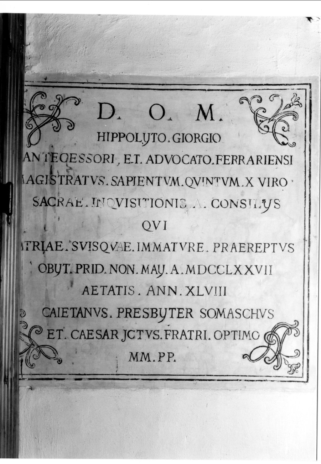 - ISCRIZIONI a tutto campo - D.O.M./ HIPPOLYTO GIORGIO/ ANTECESSORI ET ADVOCATO FERRARIENSI/ MAGISTRATUS SAPIENTUM QUINTUM X VIRO/ SACRAE INQUISITIONIS A CONSILYS/ QUI/ PATRIAE SUISQUAE IMMATURE PRAEREPTUS/ OBYT PRID.NON MAY A MDCCLXXVII/ AETATIS ANN XLVIII/ CAIETANUS PRESBYTER SOMASCHUS/ ET CAESAR JCTUS FRATRI OPTIMO/ MM.PP - lettere capitali - a solchi -