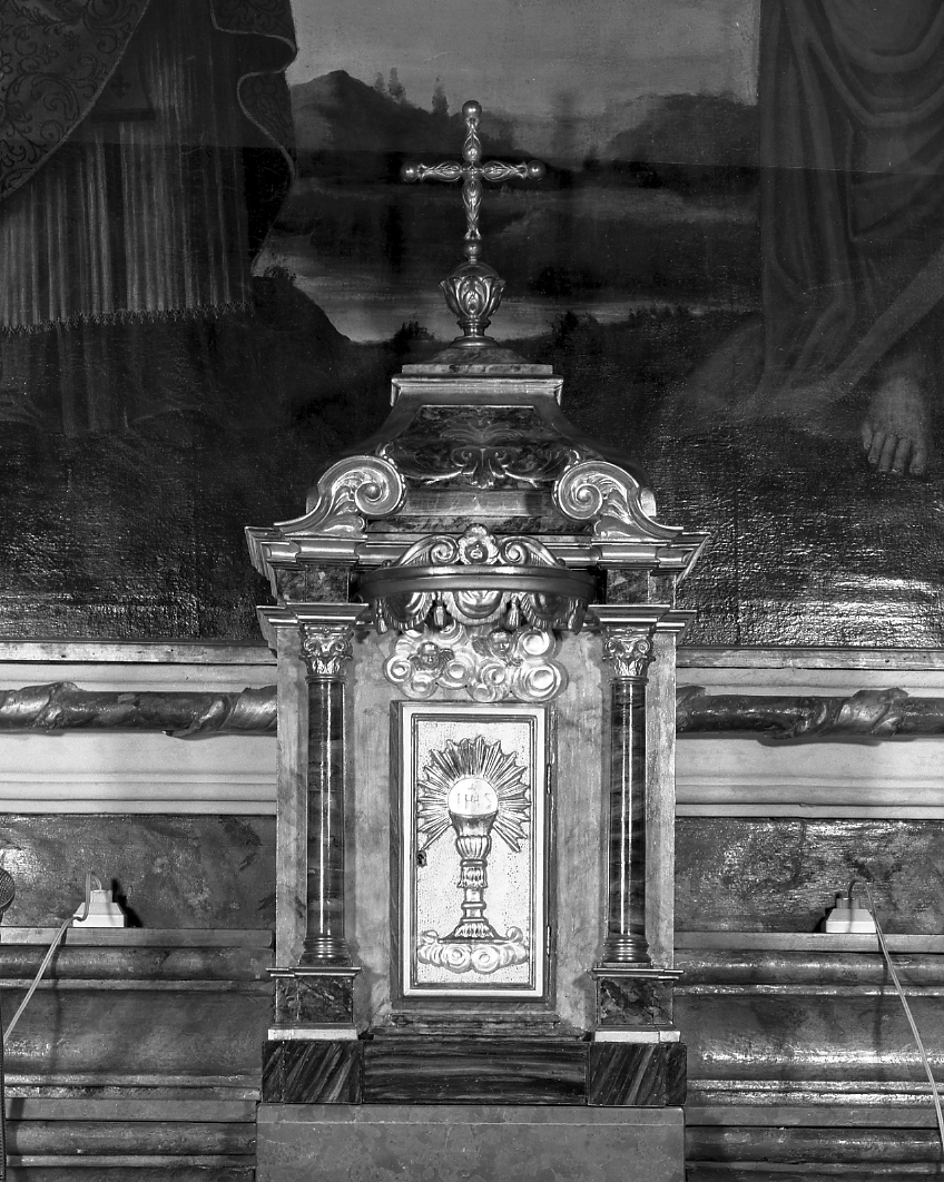 Tabernacolo di forma squadrata con due colonne corinzie, baldacchino e cupola con volute nei quattro angoli. Sportello con cornice e ostia raggiata e sopra due cherubini tra le nuvole