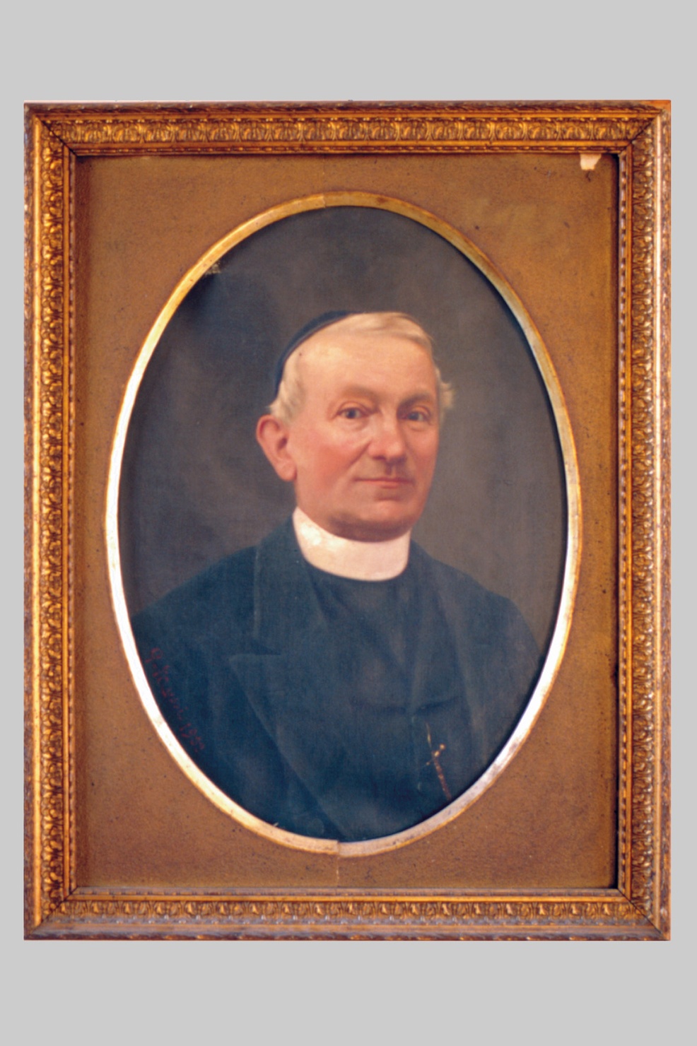 E' raffigurato entro un ovale in abiti sacerdotali con zucchetto e croce d'argento sul petto. Cornice rettangolare pertinente e coeva in legno dorato, impreziosita da rilievi a fogliami in pastiglia con passepartout ovale al centro sempre in legno dorato