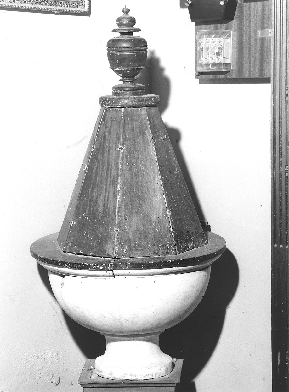 Fonte battesimale a vasca emisferica liscia e poggiante su una piccola base, chiuso da un coprifonte a piramide ottagonale arricchito da un'anfora applicata all'apice