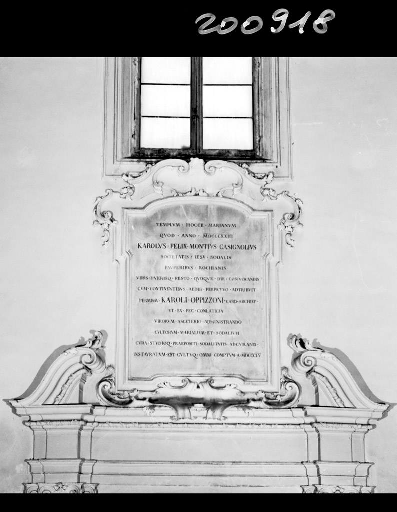 - ISCRIZIONI al centro - TEMPLUM HOCCE MARIANUM/ QUOD ANNO MDCCCXXIII/ KAROLUS FELIX MONTIUS CASIGNOLIUS/ SOCIETATIS IESU SODALIS/ PAUPERIBUS ROCHIANIS/ VIRIS PUERISQ. FESTO QUOQUE DIE CONVOCANDIS/ CUM CONTINENTIBUS AEDIS PERPETUO ADTRIBUIT/ PERMISSU KAROLI OPPIZZONI CARD. ARCHIEP./ ET EX PEC CONLATICIA/ VIRORUM ASCETERIO ADMINISTRANDO/ CULTORUM MARIALIUM ET SODALIUM/ CURA STUDIOQ. PRAEPOSITI SODALITATIS ADCURAND/ INSTAURATUM EST CULTUQ. OMNI COMPTUM A MDCCCLV - lettere capitali - a pennello - latino