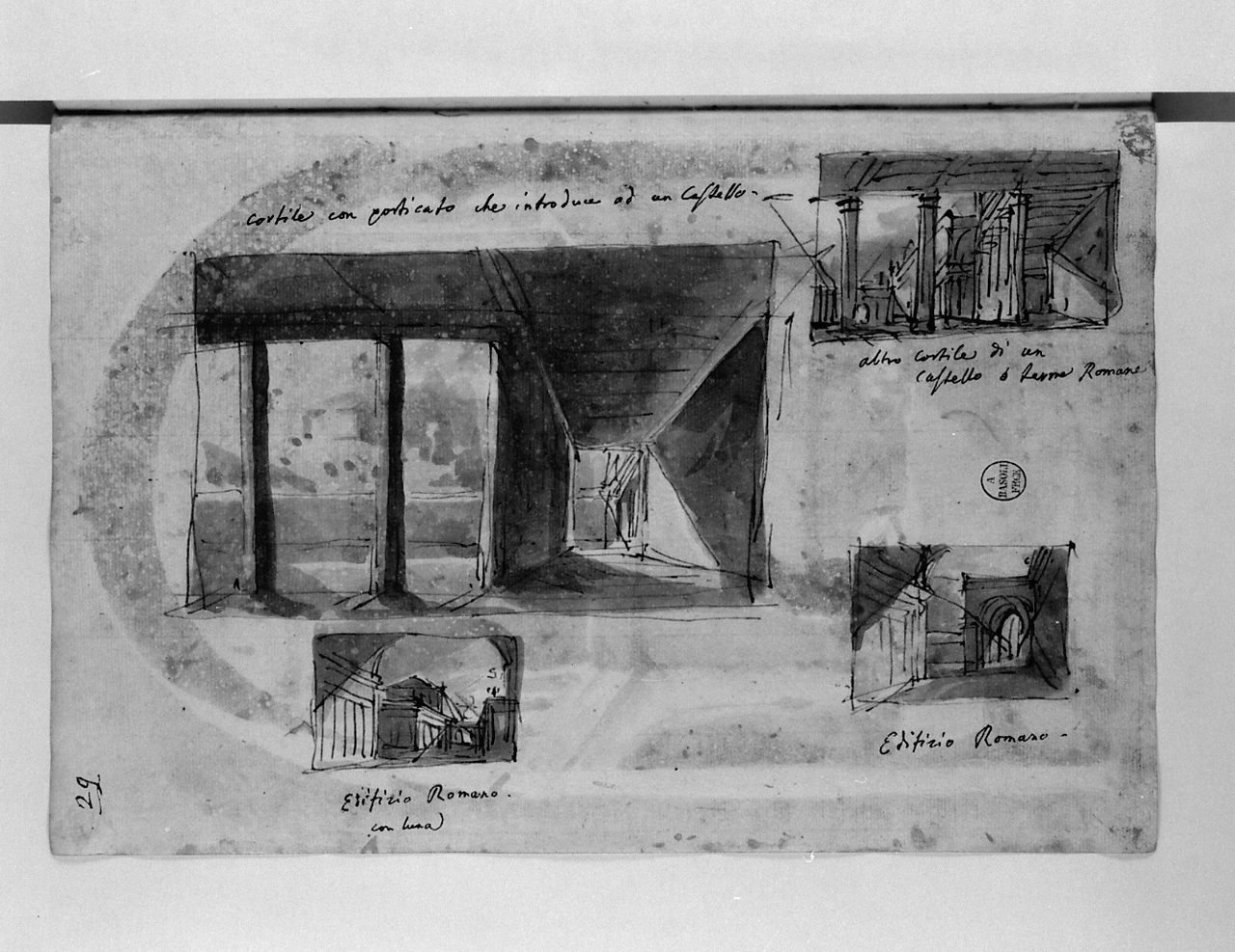 - ISCRIZIONI sopra il disegno - CORTILE CON PORTICATO CHE INTRODUCE AD UN CASTELLO - A. Basoli - corsivo - a penna -