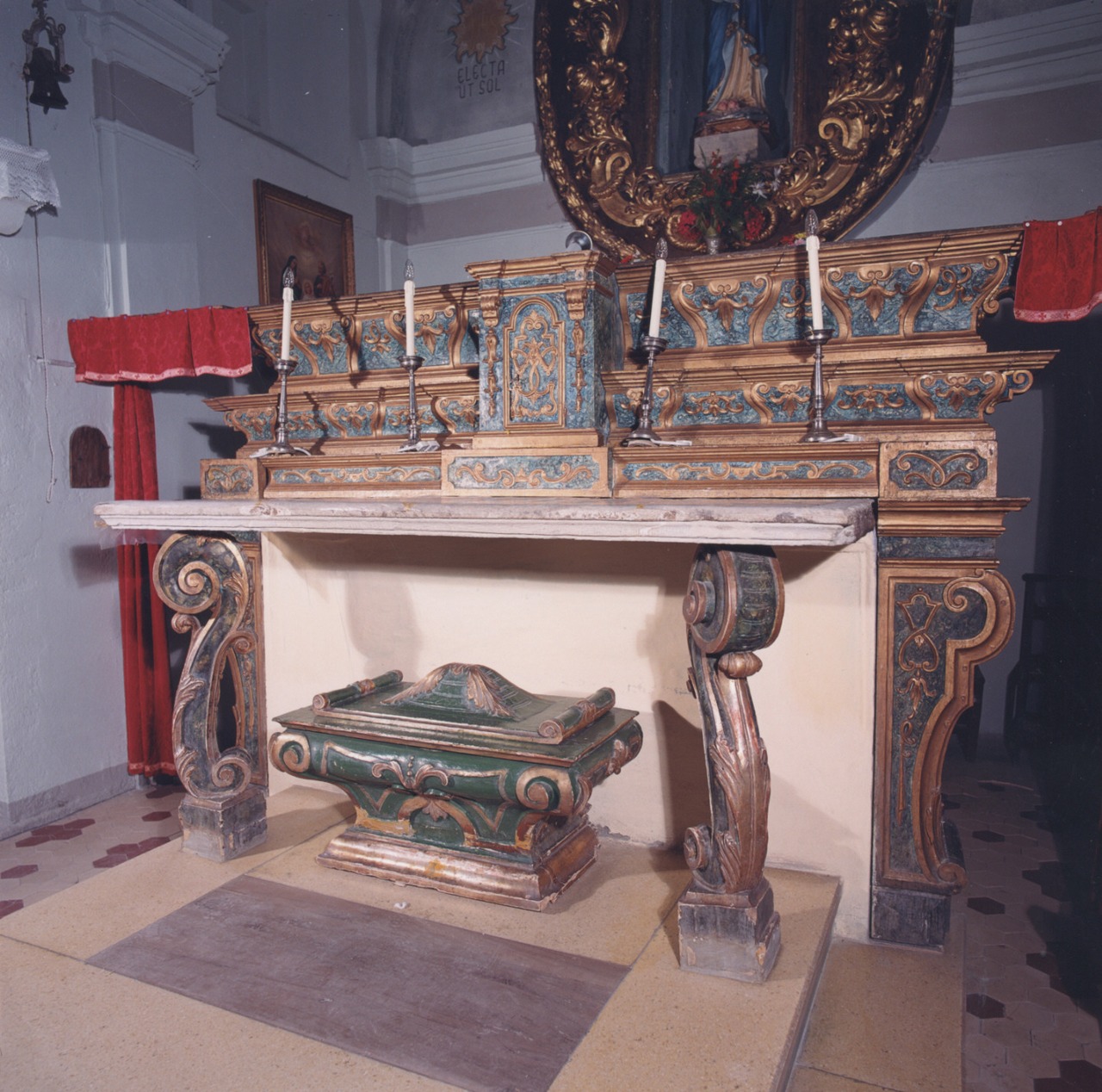 Altare in legno intagliato dipinto (in verde nei fondi) e dorato di complessa lavorazione. La mensa poggia su due sostegni modanati e terminanti a voluta. Il tabernacolo, inamovibile (vedi scheda n.00368037) è collocato al centro dell'alzata, composta da tre gradini. Tutte le parti sono finemente intagliate con motivi vegetali fogliati e ornati a volute. Intagliato sullo stesso stile anche il reliquiario posto alla base (vedi scheda n. 00368036)