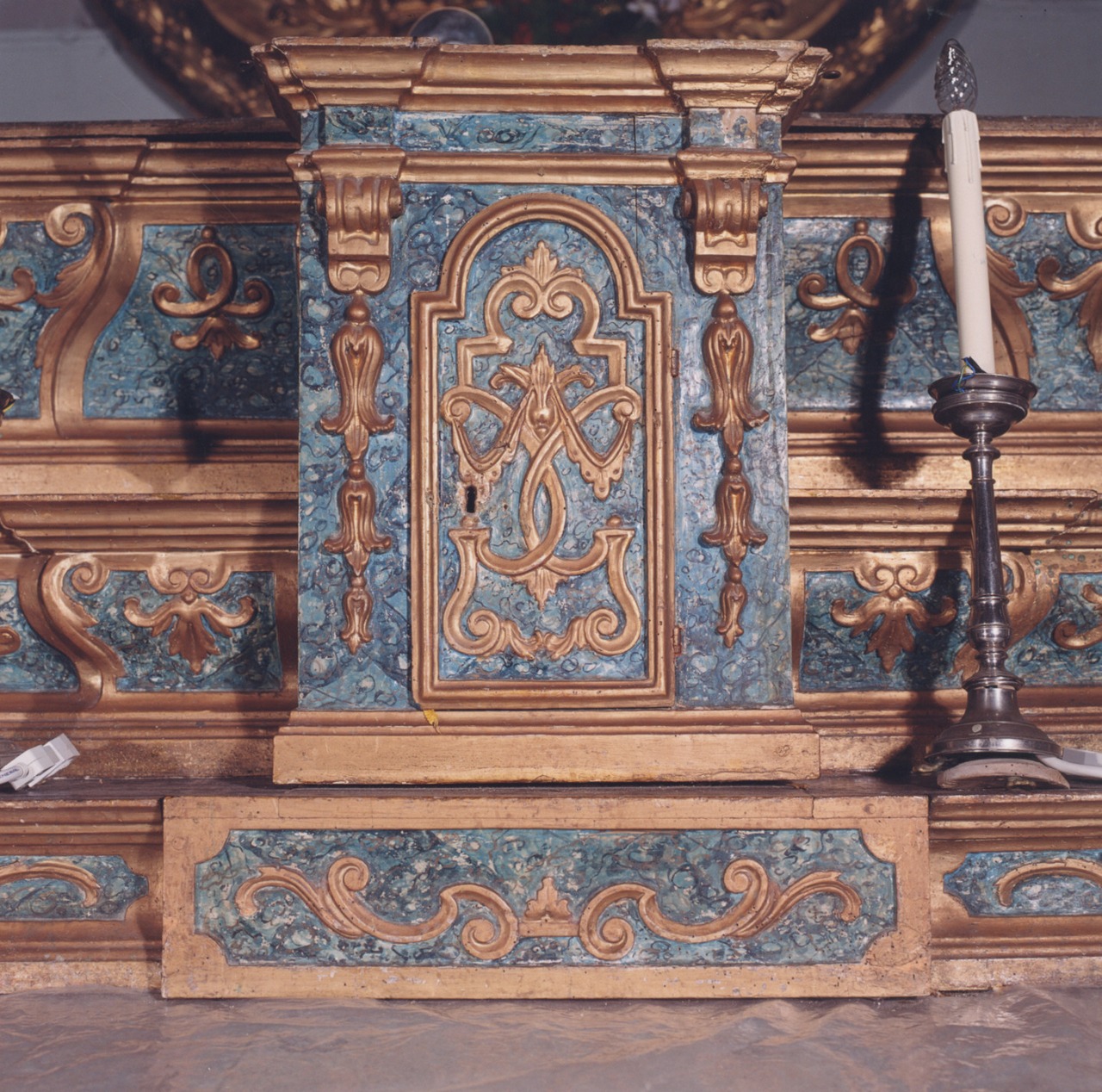 Tabernacolo inamovibile dell'altare maggiore (vd. scheda n. 00368033), intagliato, dipinto (in verde) e dorato.Riprende gli stessi motivi a rilievo dell'altare