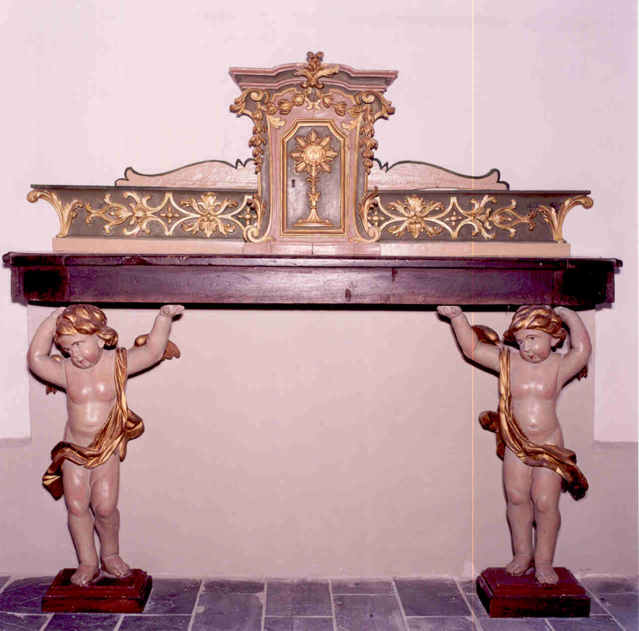 - NOTIZIE STORICO CRITICHE L'oggetto, di significativa produzione, era verosimilmente collegato con la pregevole anconetta con putti, ora ubicata nella cappella a sinistra. Entrambi i pezzi sono citati da G.Cirillo-G.Godi (1984, p.206) che propongono una datazione intorno al terzo quarto del Settecento: 1760-1770 circa. La fattura di esecuzione conferma la cronologia, anche se numerose parti sono state pesantemente ridipinte
