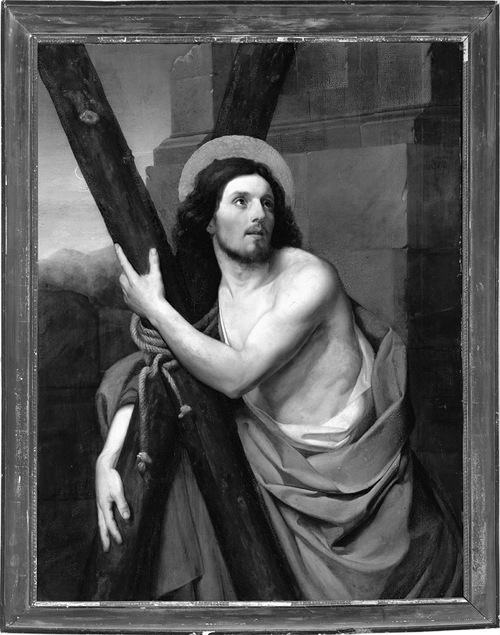 Personaggi: Sant'Andrea Apostolo. Attributi: (Sant'Andrea Apostolo) croce decussata. Elementi architettonici: muro su alto basamento. Paesaggi: colline