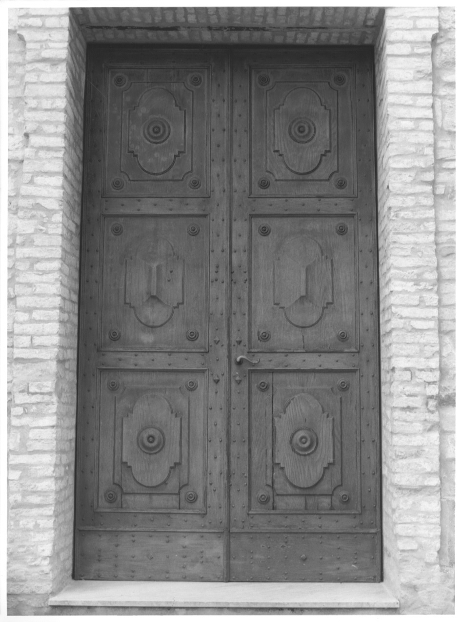 Portone a due battenti con sei specchiature a formelle disposte simmetricamente, e fitta chiodatura a borchie piramidali e rotonde