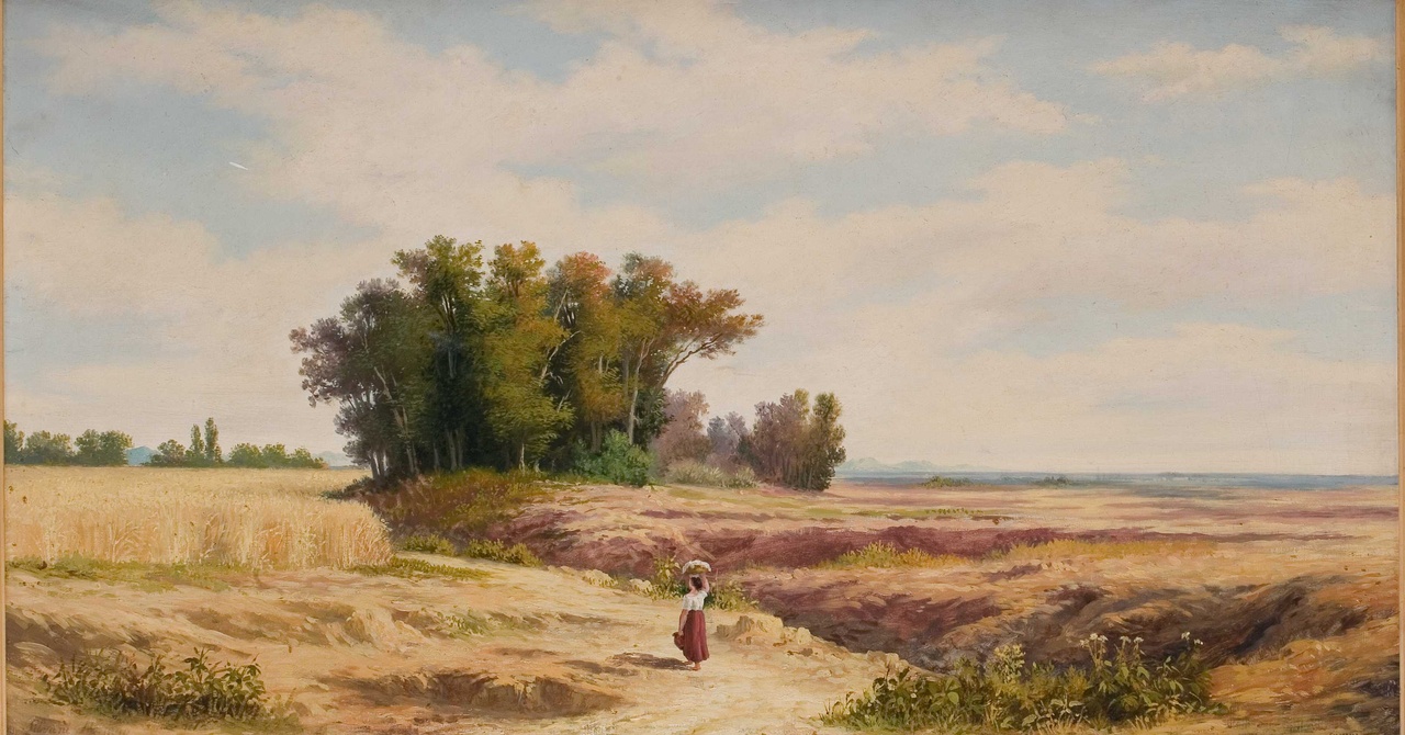 Paesaggi: pianura; campi coltivati. Vegetali: alberi; cespugli; erba. Figure: contadina. Oggetti: cesta con panni; brocca. Fenomeni naturali: luce. Fenomeni metereologici: nubi