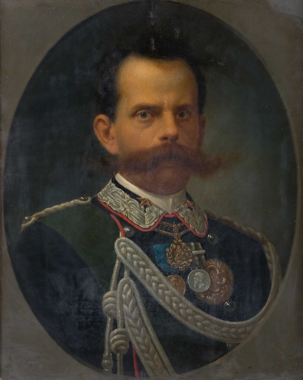 Ritratti: Umberto I Savoia. Abbigliamento: uniforme militare. Oggetti: medaglie