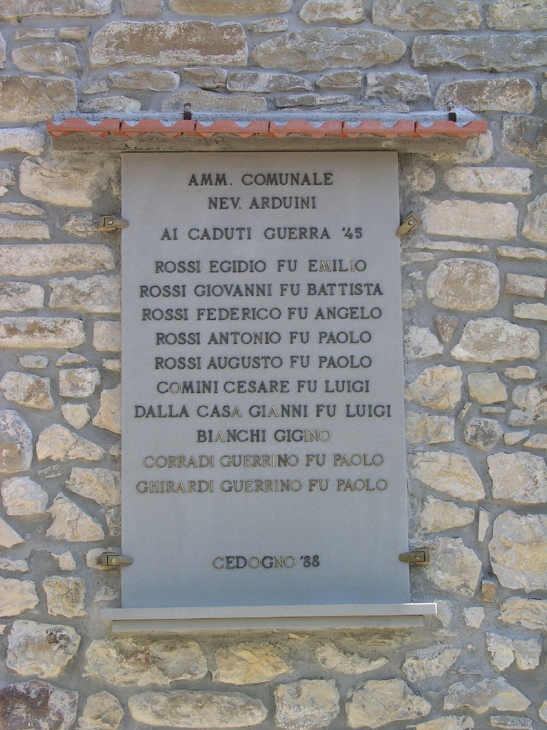 - NOTIZIE STORICO CRITICHE Fatta collocare dall'Amministrazione Comunale di Neviano degli Arduini nel 1988, la lapide ripete, nelle dimensioni e nella sobria semplicità delle proporzioni, la nitidezza formale dell'epigrafe collocata in memoria dei caduti del primo conflitto mondiale, a fianco della quale è innestata