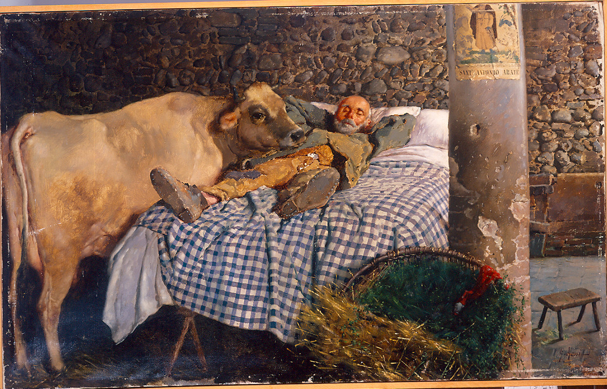 Personaggi: contadino. Abbigliamento: (contadino) logori abiti da lavoro. Animali: mucca. Interno: stalla. Mobilia: giaciglio con lenzuola e coperta a scacchi; sgabello. Oggetti: cesta con fieno; oleografia con la raffigurazione di Sant'Antonio Abate