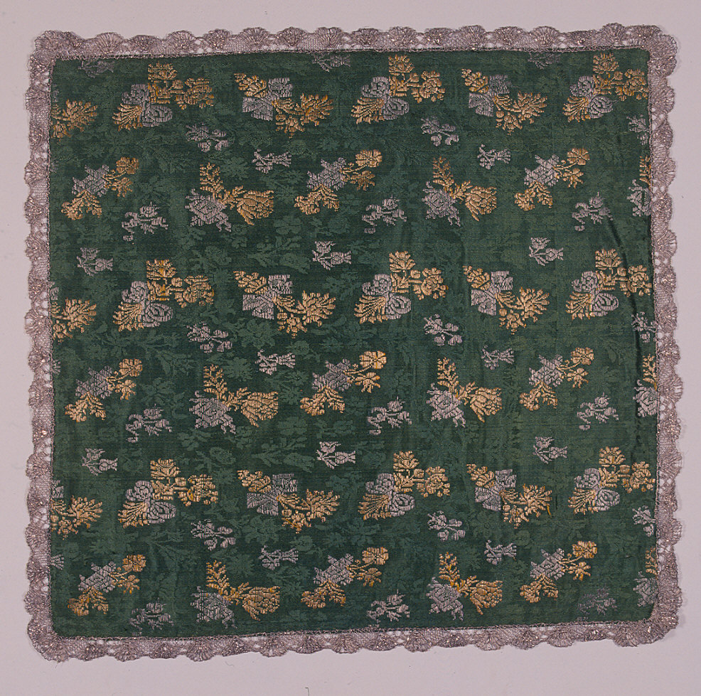 Parato composto di due pianete, due stole, due manipoli, due veli da calice e due borse per corporale. Damasco broccato. Ordito e trama in seta verde brillante eseeguono il fondo in raso da 8 faccia ordito e il disegno in raso da 8 faccia trama. Quest'ultimo è completato da trame broccate in oro e argento filato a fili doppi. Teorie parallele e sfalsate ad orientamento alterno formate da mazzetti di fiori stilizzati descritti in oro stretti alla base da nastri in argento. I mazzetti sono intercalati da ramoscelli fioriti argento. Fondo e motivi di fondo verde. galloni eseguiti a telaio in argento filato e seta avorio decorati da rami di foglie e frutti, da nastri sinuosi, da fruttin e foglie, da fiori e foglie e galloni lavorati a fuselli in argento filatom e lamina. Fodera in taffetas di seta avorio, in raso e diagonale di cotone avorio. Stola e manipolo recano all'estremità una frangia argento