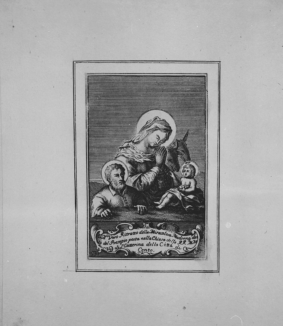 - ISCRIZIONI in basso, entro il cartiglio - Il Vero Ritratto della Miracolosa Madonna det/ ta del Presepio posta nella Chiesa delle RR. MM/ di S. Caterina della Città di/ Cento - corsivo -
