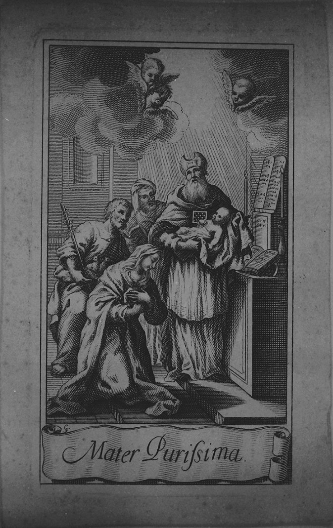 Personaggi: Madonna; Gesù Bambino; San Giuseppe; Simeone. Figure maschili: uomo barbuto con turbante. Figure: cherubini. Fenomeni naturali: nuvole. Fenomeni divini: fascio luminoso. Attributi: (San Giuseppe) cesto con colombe votive; verga fiorita. Suppellettili ecclesiastiche: candelieri; altare. Interno: tempio