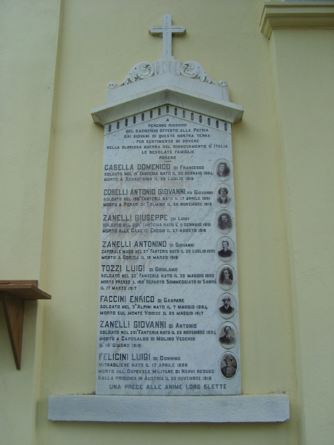 Lapide commemorativa in marmo di forma rettangolare, rastremata e cuspidata in corrispondenza del margine superiore, recante incisi i nomi dei caduti (disposti senza un ordine apparente) con il corpo e il reggimento di provenienza, la data di nascita e la data e il luogo della morte. I nomi sono corredati a destra da fotoceramiche (firmate tutte dall'esecutore L. Pagliano) che li ritraggono in abiti militari e civili. L'ornamentazione è circoscritta al solo motivo cruciforme, scolpito in alto al centro, e ad una semplice decoro a girali d'acanto ai lati della croce. In basso a destra si trova la firma della ditta Maggi di Cremona