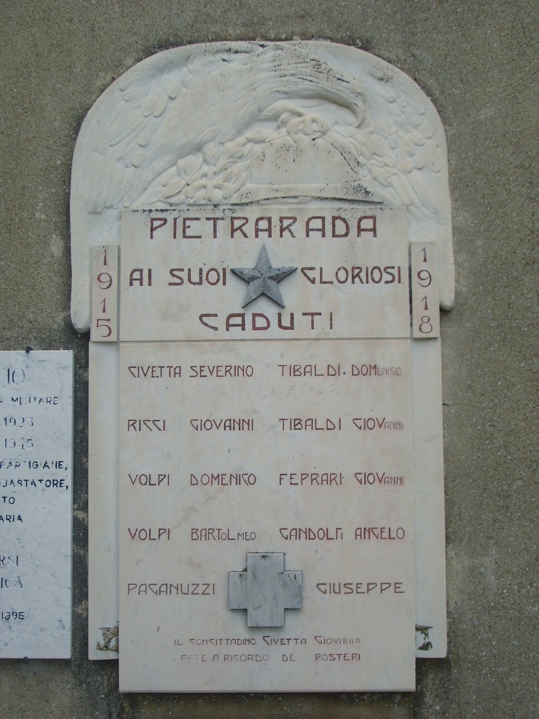 Lapide commemorativa di forma rettangolare, centinata lungo il margine superiore, con elementi decorativi incisi a bassorilievo che presentano una ornamentazione formata da un' aquila che stringe con l'artiglio foglie di lauro e quercia e che sovrasta l'elmo del fante posto più sotto. Completa la decorazione una stella d'Italia, applicata in bronzo, intorno alla quale troviamo l'epigrafe, ancora più sotto una croce patente in marmo bardiglio. In corrispondenza degli angoli in basso si trovavano due borchie romboidali ora staccate. Al centro della lapide i nomi dei nove militari caduti di Pietrarada (disposti senza un ordine apparente) e il nome del donatore