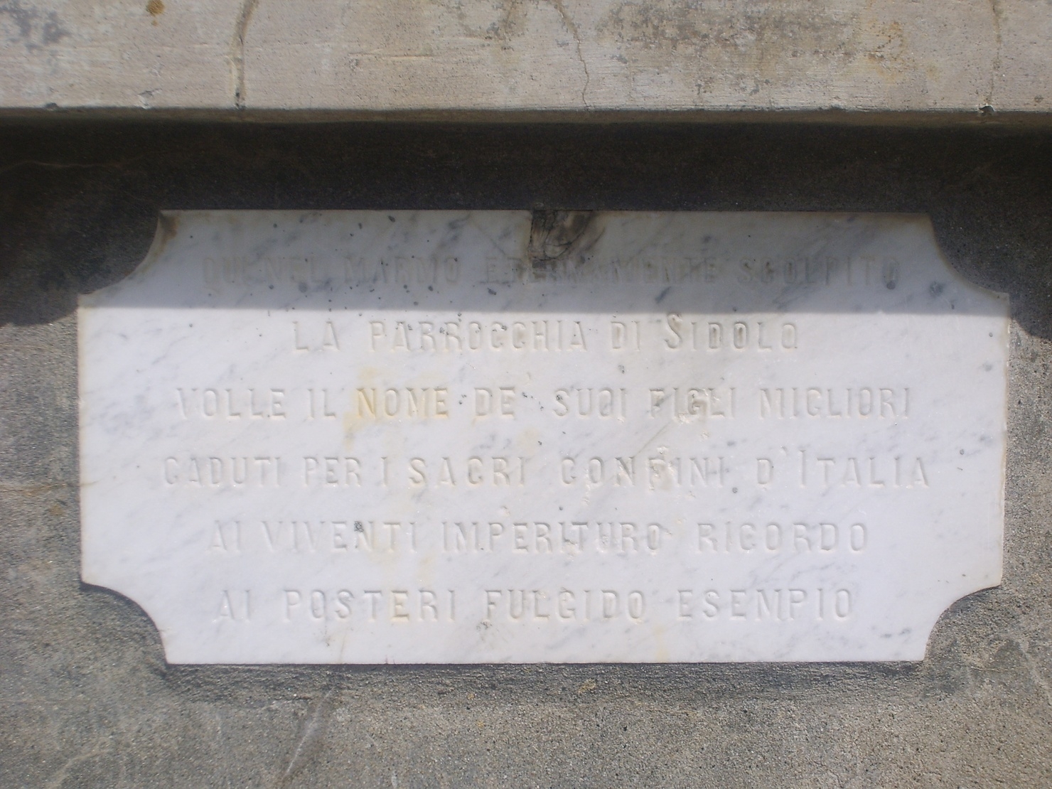 - NOTIZIE STORICO CRITICHE Il monumento in esame fonde i consueti riferimenti iconografici della monumentalistica ai caduti (fucile, stella d'Italia, serti di lauro e quercia) con le caratteristiche interessanti del richiamo all'architettura classica. Tra i militari caduti della frazione di Sidolo, Giuseppe Conti (cfr. bibliografia) ricorda il caporale Sidoli Giovanni, del 255° reggimento fanteria, nato nel 1893 nel comune di Bardi, loc. Casagrassa, morto il 28 giugno 1918 sul Piave per ferite riportate in combattimento, decorato di medaglia d'argento al valore militare. Non si conoscono notizie riguardo la vicenda del capitano Balestrazzi Luigi, che viene ricordato solo nella lapide in oggetto, ma non viene menzionato nell' Albo d'oro dei militari caduti nella guerra 1915-1918, nel monumento ai caduti del capoluogo e nemmeno nei registri di stato civile comunali