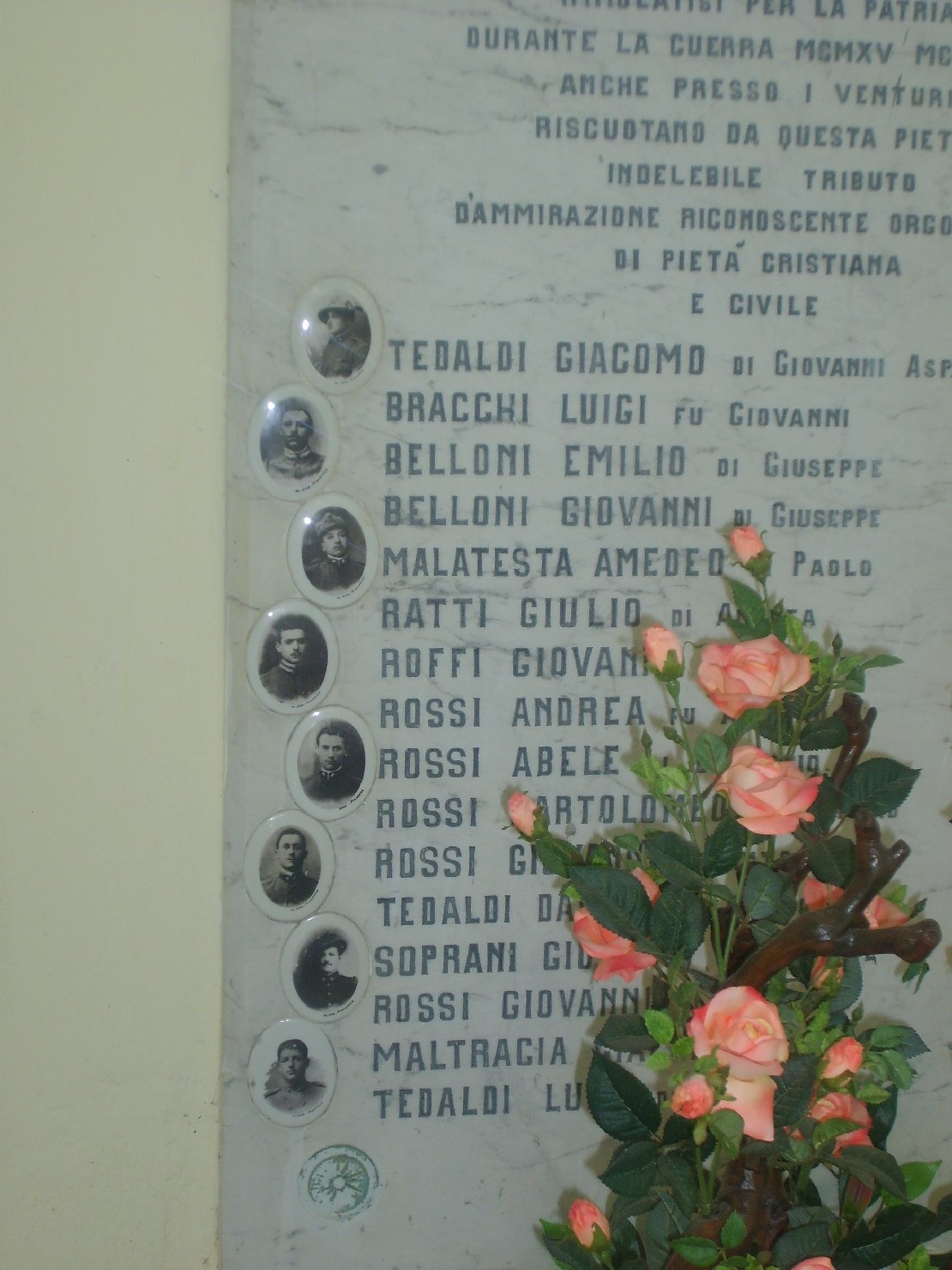 - NOTIZIE STORICO CRITICHE Considerando alcune notizie riportate nella scheda riferita al monumento ai caduti di Bardi capoluogo (cfr. scheda 08/00000009), alcune fonti bibliografiche (come l' elenco dei militari morti nella guerra 1915-1918 del Comune di Bardi e ex Comune di Boccolo dei Tassi redatto da Giuseppe Conti, cfr. bibliografia) e l'epigrafe presente nel manufatto in esame, dobbiamo ritenere che la lapide di Santa Giustina Val Lecca venne realizzata prima del 1923, anno in cui Boccolo dei Tassi cessò di essere comune e venne annesso al comune di Bardi (e così anche le località come Santa Giustina). La lapide è stata quindi realizzata intorno prima del 1923, la cappella invece è stata costruita dopo la fine della seconda guerra mondiale, come dimostra la presenza di una lapide ai caduti della guerra 1940-1945. Da segnalare, tra i militari caduti della frazione di Santa Giustina, il nome di Tedaldi Giacomo di Giovanni, aspirante ufficiale del 4° reggimento alpini di stanza ad Ivrea, nato il 4 novembre 1894 e morto il 24 ottobre 1918 sul monte Solarolo per ferite riportate in combattimento, decorato di medaglia di bronzo al valore militare