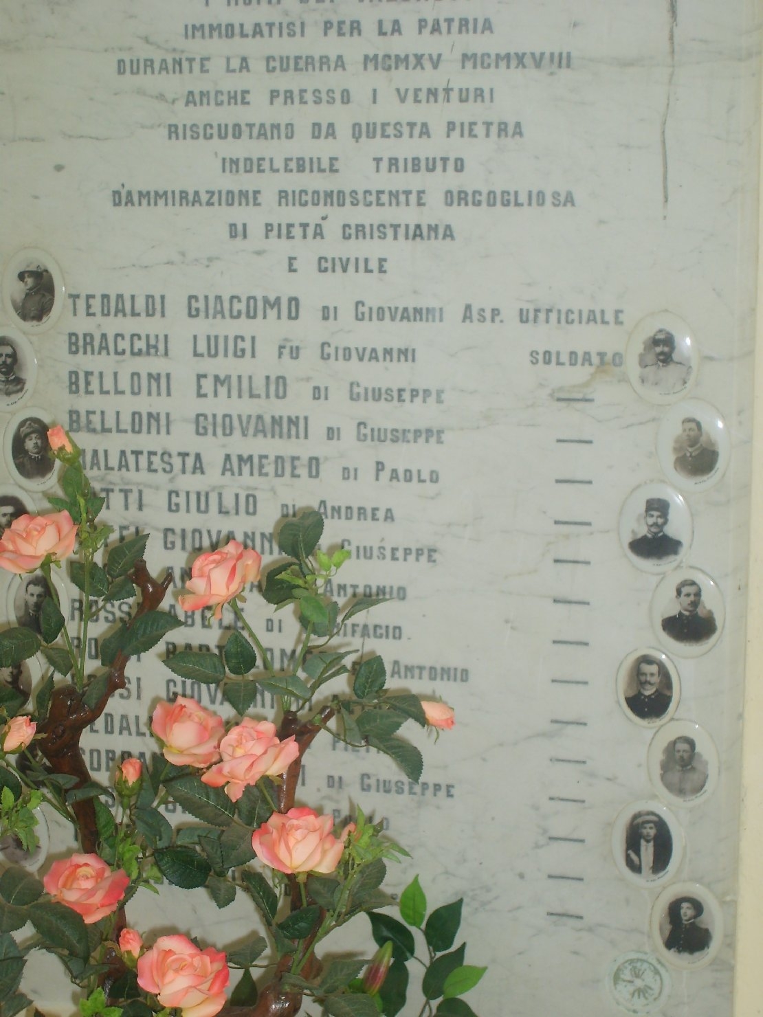 Monumento commemorativo ai caduti dei due conflitti mondiali, costituito da una cappella in cemento e pietra, con in alto al centro la dedica e sormontata da una croce latina in ferro; all'interno, al quale si accede tramite un cancello in ferro battuto, vengono riunite la lapide in marmo a ricordo dei caduti della prima guerra mondiale, di forma rettangolare, con l'epigrafe e i nomi dei caduti disposti secondo il grado e in ordine alfabetico, corredati da fototessere in ceramica; nel lato sinistro della cappella è stata aggiunta una lapide che commemora i caduti della seconda guerra