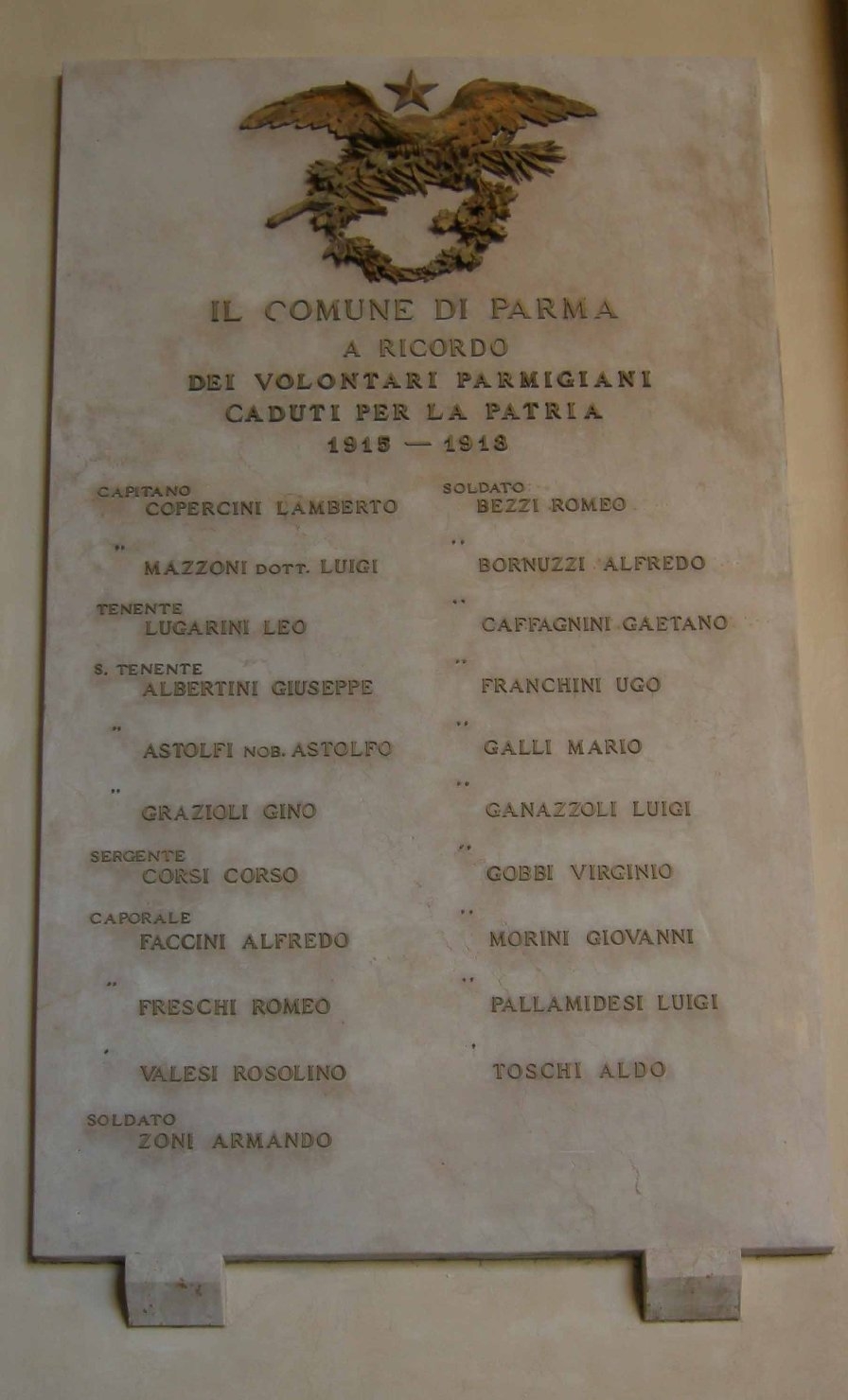 - ISCRIZIONI in alto, al centro - IL COMUNE DI PARMA/ A RICORDO/ DEI VOLONTARI PARMIGIANI/ CADUTI PER LA PATRIA/ 1915-1918/ - lettere capitali -