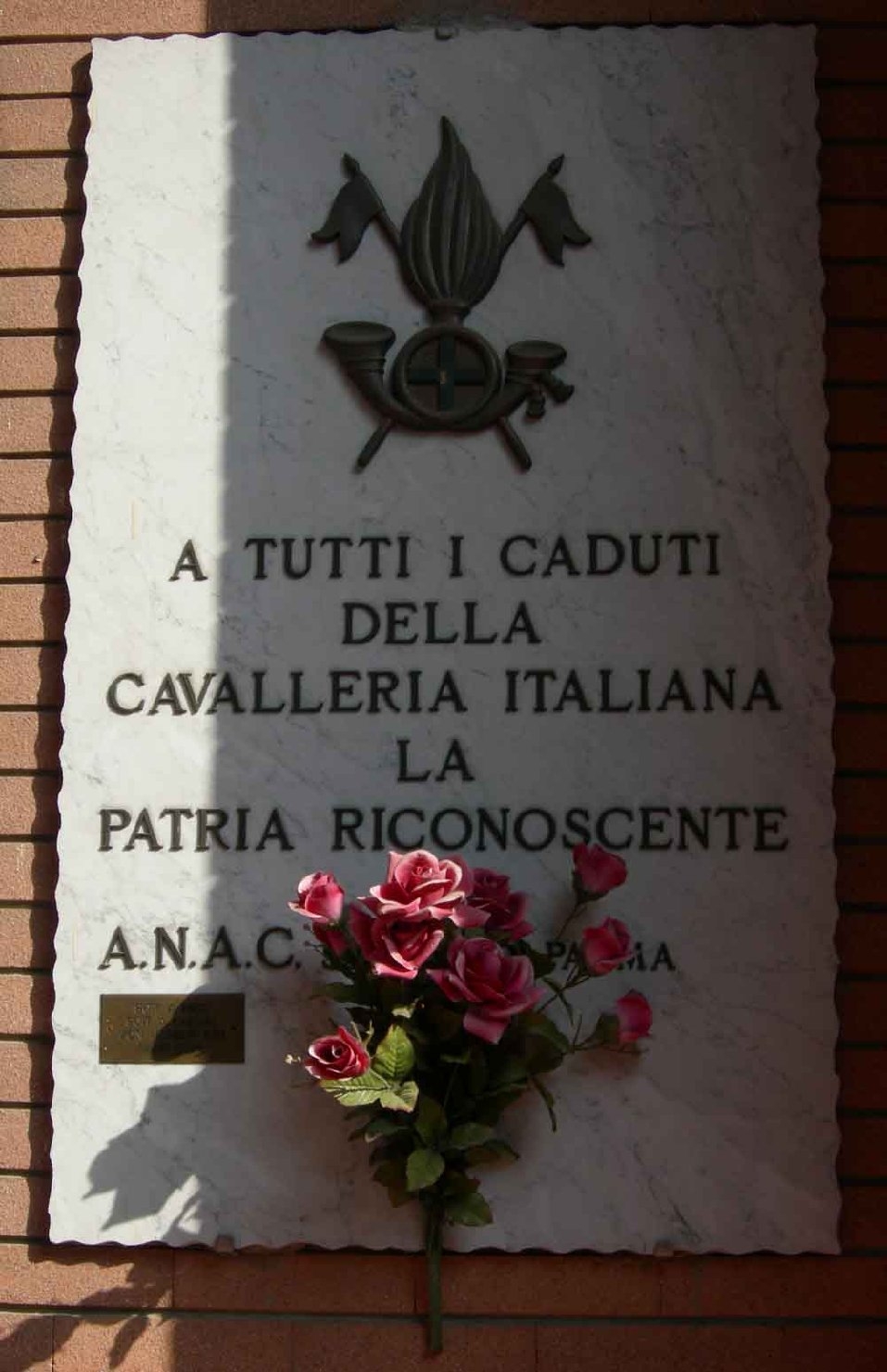 - NOTIZIE STORICO CRITICHE Pur non essendo datata, la lapide in memoria dei caduti della cavalleria italiana manifesta una data di apposizione piuttosto recente e si inserisce in un filone di commemorazioni lontane dalla prima guerra mondiale e legate spesso a decennali o ad anniversari. L'estrema semplicità del manufatto in esame e del testo dell'iscrizione fa pensare, più che a scarsi mezzi economici, ad una volontà di ricordare i caduti senza prendere una posizione di esaltazione eroica, né porre l'accento sul compianto doloroso e cristiano, anche se un accento nazionalistico si può rintracciare nella menzione della patria di cui l'associazione si fa portavoce
