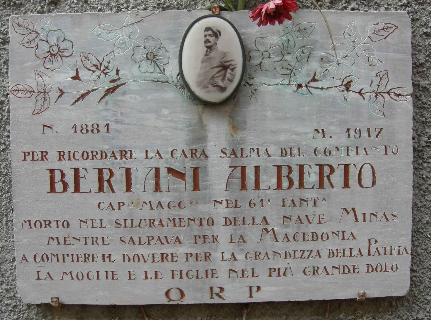 - ISCRIZIONI al centro - N. 1881 M. 1917/ PER RICORDARE LA CARA SALMA DEL COMPIANTO/ BERTANI ALBERTO/ CAP.LE MAGG.RE NEL 61° FANT.A/ MORTO NEL SILURAMENTO DELLA NAVE MINAS/ MENTRE SALPAVA PER LA MACEDONIA/ A COMPIERE IL DOVERE PER LA GRANDEZZA DELLA PATRIA - lettere capitali - a solchi -