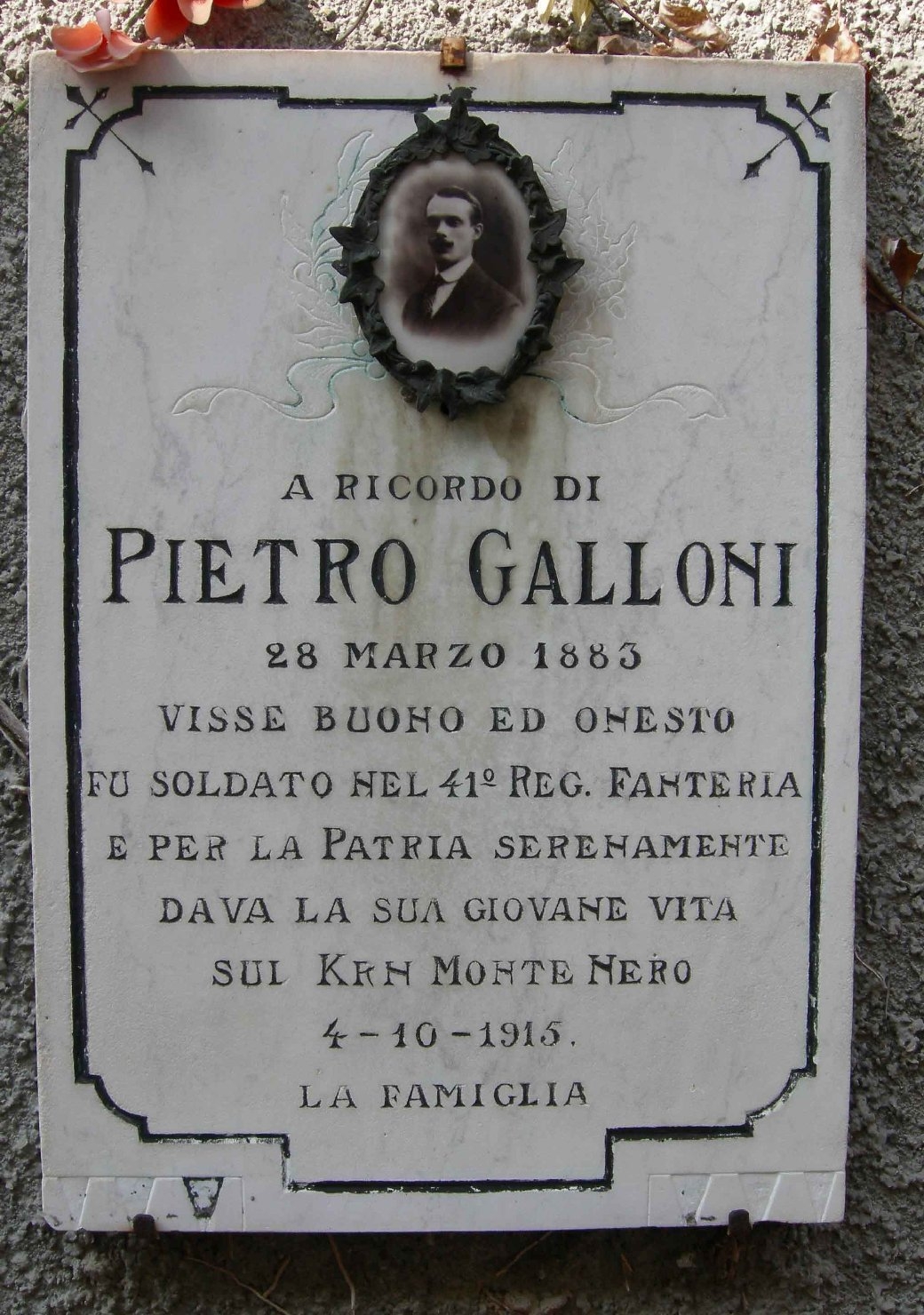 - NOTIZIE STORICO CRITICHE La semplice lapide posta a ricordo di Pietro Galloni è un esempio caratteristico del gruppo "privato" di commemorazione ai caduti della prima guerra mondiale; rispetto ai manufatti vicini tipologicamente, si sottolinea la precocità della morte del soldato del 41° Reggimento Fanteria, avvenuta nel primo anno di guerra italiana, combattendo sul Monte Sleme. Non si conosce con certezza la cronologia di apposizione della lapide che commemora una salma lontana, ma gli elementi di confronto fanno pensare che possa essere stata una delle prime, quindi forma ed epigrafe possono aver fornito da modello per gli esemplari posteriori. La semplicità dell'oggetto e dei pochi elementi decorativi che lo connotano fanno inoltre pensare ad una scelta in economicità della famiglia che, come molte altre, non poteva permettersi monumenti più impegnativi e costosi