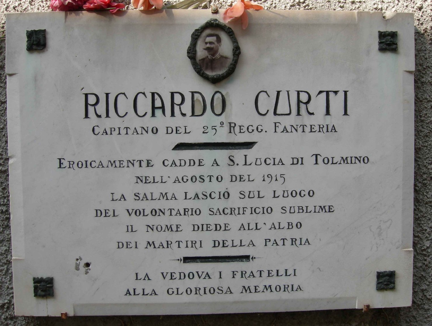 - ISCRIZIONI al centro - RICCARDO CURTI/ CAPITANO NEL 25° REGG. FANTERIA/ EROICAMENTE CADDE A S. LUCIA DI TOLMINO/ NELL'AGOSTO DEL 1915/ LA SALMA LASCIO' SUL LUOGO/ DEL VOLONTARIO SACRIFICIO SUBLIME/ IL NOME DIEDE ALL'ALBO/ DEI MARTIRI DELLA PATRIA - lettere capitali -