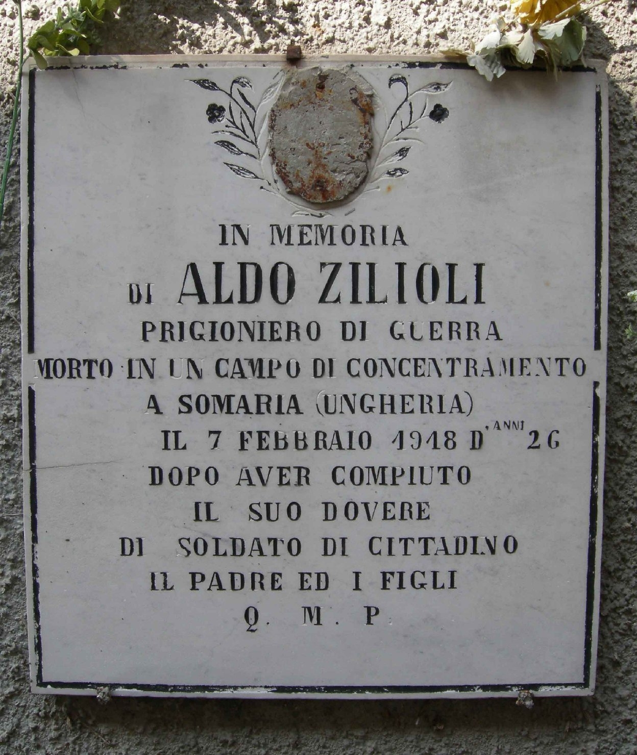 - ISCRIZIONI al centro - IN MEMORIA/ DI ALDO ZILIOLI/ PRIGIONIERO DI GUERRA/ MORTO IN UN CAMPO DI CONCENTRAMENTO/ A SOMARIA (UNGHERIA) IL 7 FEBBRAIO 1918 D'ANNI 26/ DOPO AVER COMPIUTO/ IL SUO DOVERE/ DI SOLDATO CITTADINO - lettere capitali - a solchi -