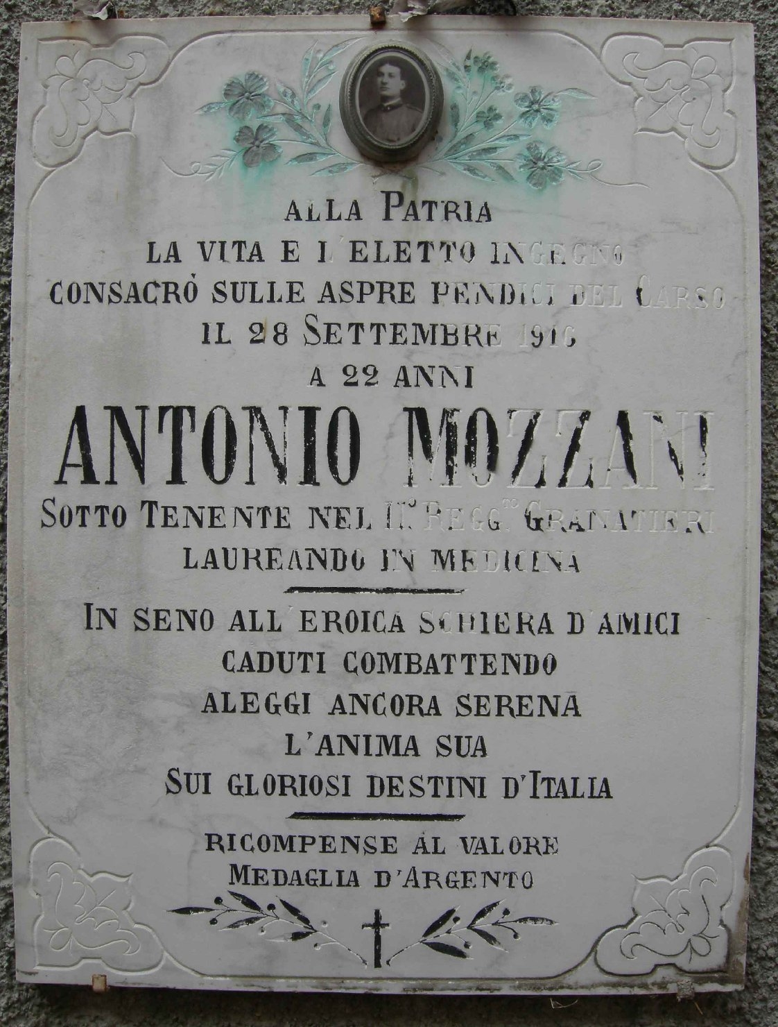 Semplice lapide commemorativa di forma rettangolare, rubricata, in marmo bianco e con una iscrizione posta dalla famiglia a ricordo del tenente Antonio Mozzani, realizzata tramite lettere a solchi riempite di impasto scuro. Gli elementi decorativi consistono in incisioni di carattere floreale, poste sia ai quattro angoli della lastra, sia ai lati della fotoceramica ovale incorniciata da una essenziale modanatura di bronzo, sia in basso dove compaiono due piccoli rami d'ulivo con al centro una croce