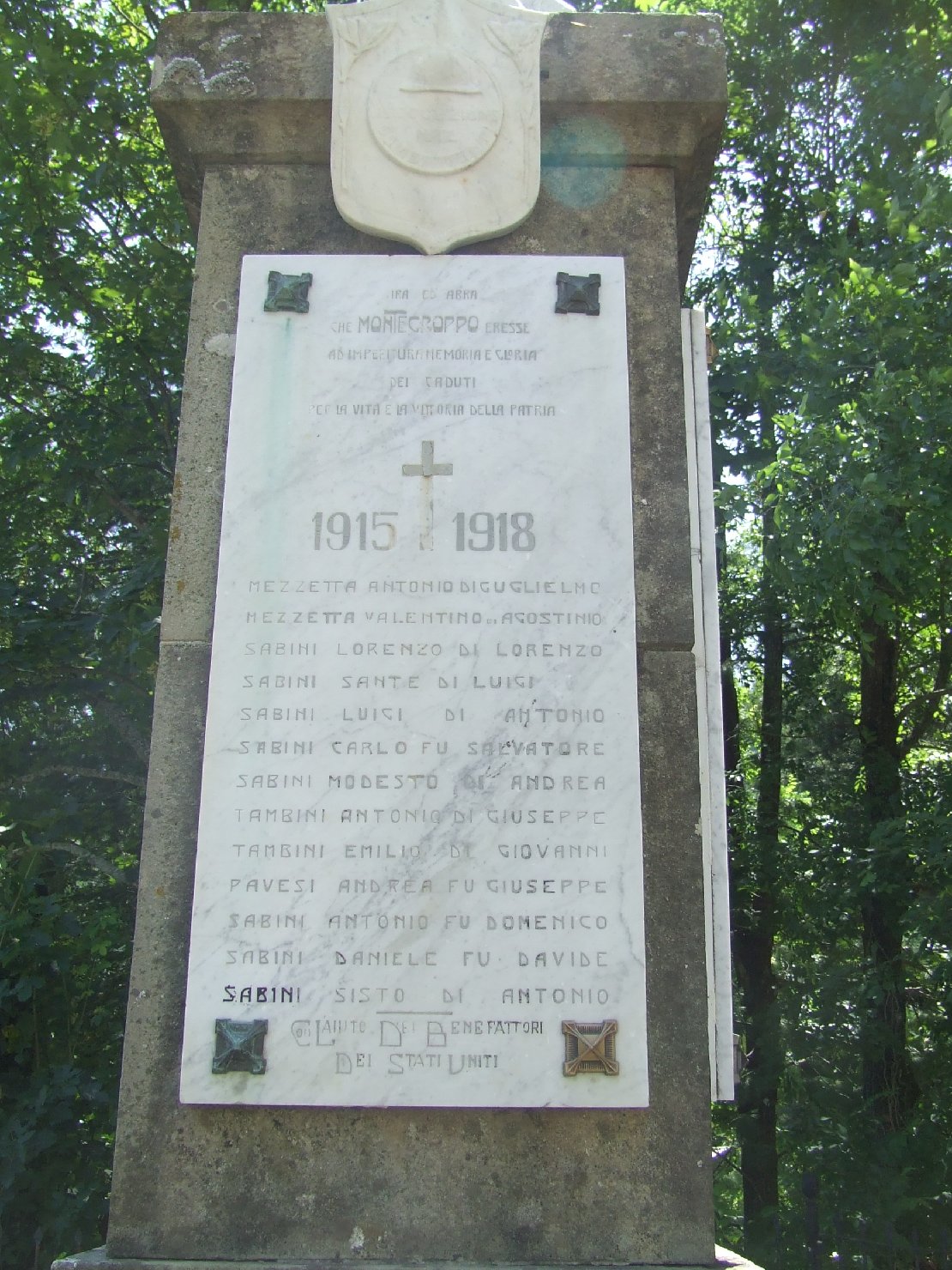 - ISCRIZIONI fronte - IRA ED ARRA/ CHE MONTEGROPPO ERESSE/ AD IMPERITURA MEMORIAE GLORIA/ DEI CADUTI/ PER LA VITA E LA VITTORIA DELLA PATRIA/ 1915 1918/ MEZZETTA ANTONIO DI GUGLIELMO/ MEZZETTA VALENTINO DI AGOSTINO/ SABINI LORENZO DI LORENZO/ SABINI SANTE DI LUIGI/ SABINI LUIGI DI ANTONIO/ SABINI CARLO FU SALVATORE/ SABINI MODESTO DI ANDREA/ TAMBINI ANTONIO DI GIUSEPPE/ TAMBINI ELIO DI GIOVANNI/ PAVESI ANDREA FU GIUSEPPE/ SABINI ANTONIO FU DOMENICO/ SABINI DANIELE FU DAVIDE/ SABINI SISTO DI ANTONIO/ CON L'AIUTO DEI BENEFATTORI/ DEI STATI UNITI - lettere capitali -